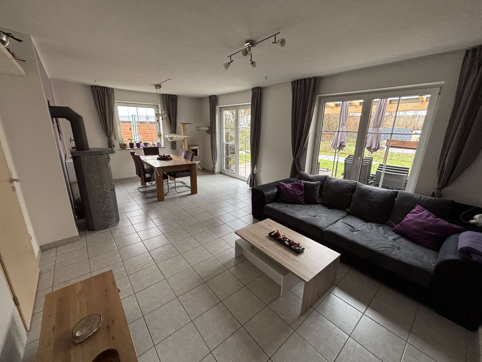 Im Erdgeschoss befinden sich die Wohnküche mit hellem Essbereich und Speisekammer, ein Gäste-WC, ein Abstellraum und das großzügige Wohn-/Esszimmer, in dem ein Specksteinofen für gemütliche Wärme sorgt. Vom Wohnzimmer aus gelangen Sie auf die überdachte Terrasse und in den schönen Garten.