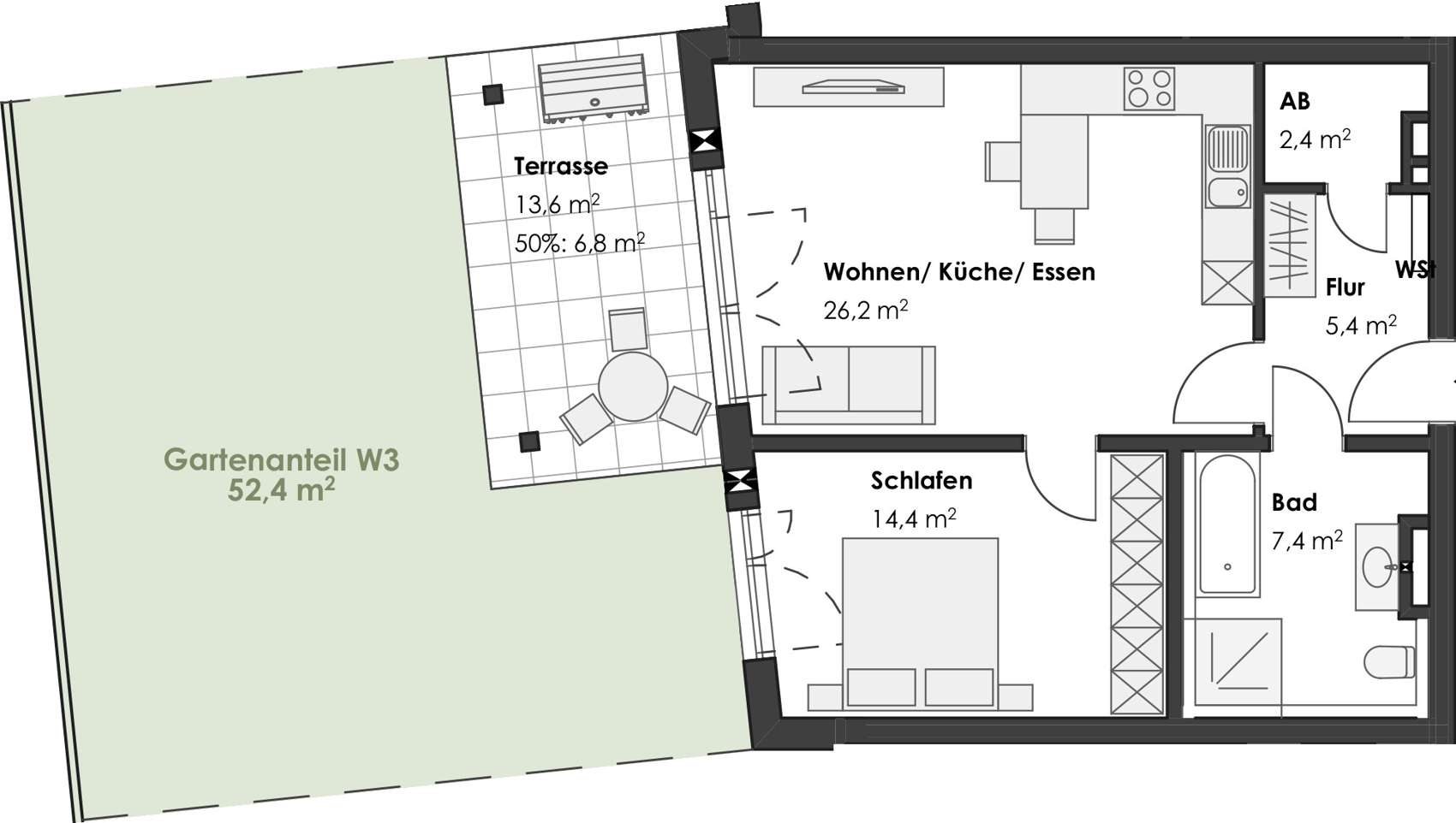 Bei der hier angebotenen Wohnung handelt es sich um eine 2-Zimmer-Erdgeschosswohnung mit großer Terrasse und eigenem Gartenanteil. mit etwas mehr als 50 m². Hier kann der Feierabend richtig genossen werden, oder der "grüne Daumen" seine Erfüllung finden.