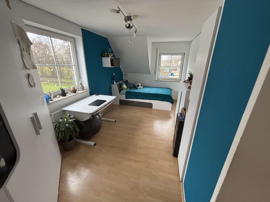 Das Obergeschoss ist mit Schlafzimmer, zwei Kinderzimmern bzw. Arbeitszimmern und dem Bad (mit Dusche und Badewanne) ideal aufgeteilt. Ein weiterer Wohnraum kann im ausgebauten Dachspitz des Hauses toll genutzt werden.